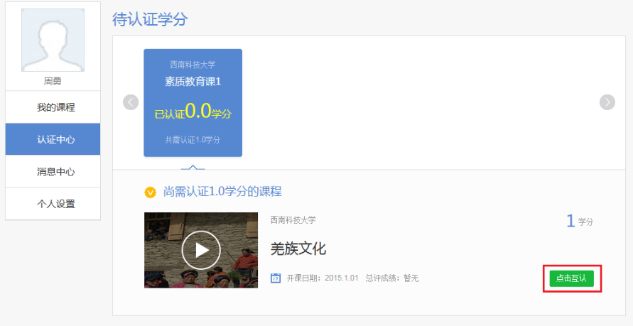 7、点击“认证中心”,确认要学习该课程则点击“点击互认”按钮,互认之后该门课程即可作为素质教育课计分(最好先完成下面的学习,确认成绩合格之后再互认);